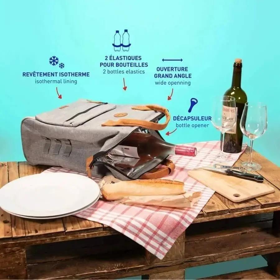 Peut contenir : 2 bouteille 75cl / 1 paquet de chips / 4 verres / Votre pique-nique