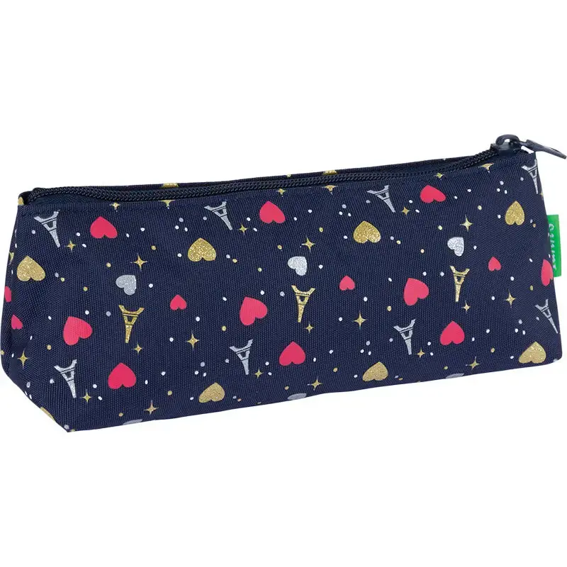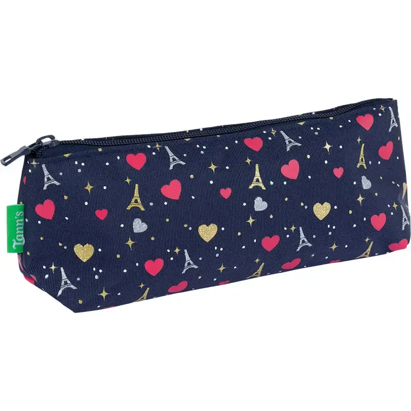 La Trousse Triangle Tann’s « Emilie » est idéale pour accompagner les **élèves du CP au collège**, alliant **design élégant et grande praticité**. Son motif rayé bleu marine, son **patch cœur en bouclette avec fil lurex** et sa **sérigraphie dorée et argentée sur la poche**, inspirée du **thème Paris**, lui confèrent une **touche raffinée et intemporelle**.