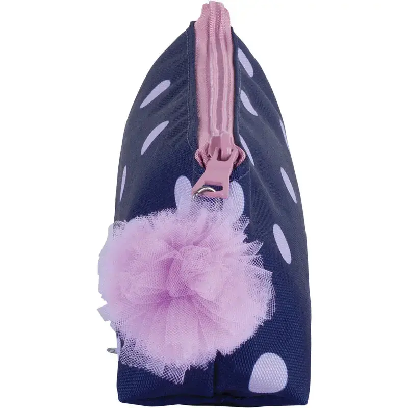 La Trousse Triangle Tann’s « Romy » est conçue pour accompagner les **élèves du CP au collège**, alliant **design élégant et grande praticité**. Son bleu marine à pois roses, ses **ornements pailletés** et ses **tirettes de zip ornées de pompons colorés en tulle** apportent une **touche chic et originale**.